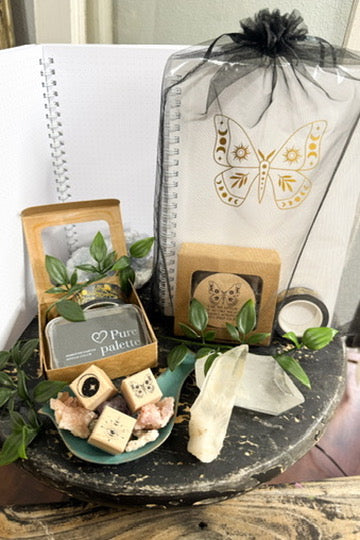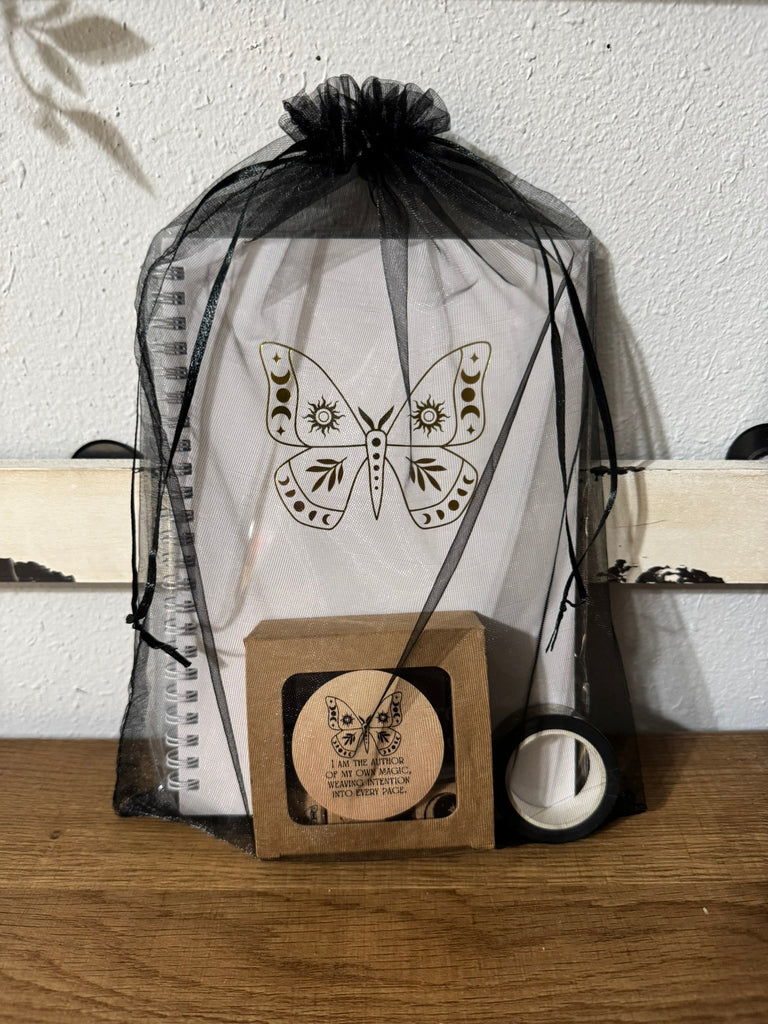 Contains: a Notebook, Stamp & Ink Set, Gold Foil Celestial Washi Tape inside of a black organza bag.