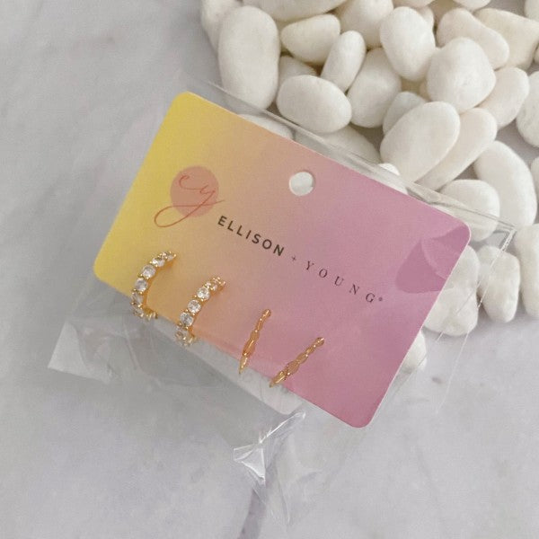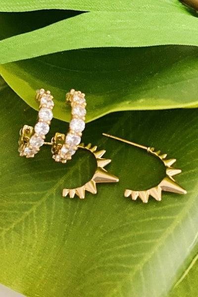 Refresh your style with this two-pair set of mini hoop earrings. The perfect mix of simple yet sparkly shines and edgy spiky details will glam up your look no matter the occasion. Get the best of both worlds with an elegant and stylish design.