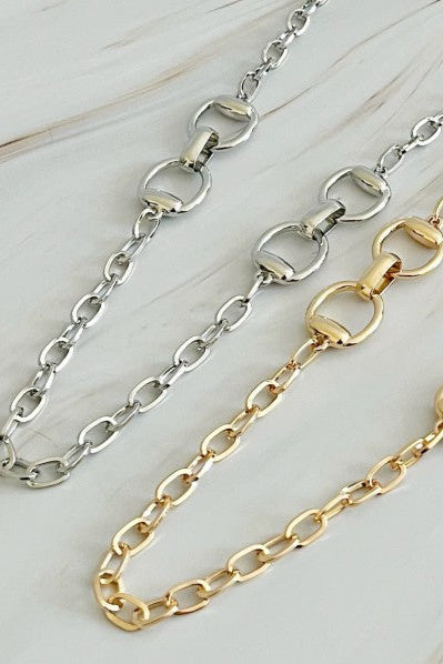 This Double Equestrian Chain Necklace boasts a chic and edgy design, making it the perfect accessory for any occasion. Its stylish and unique appearance is sure to make a statement and elevate any outfit.