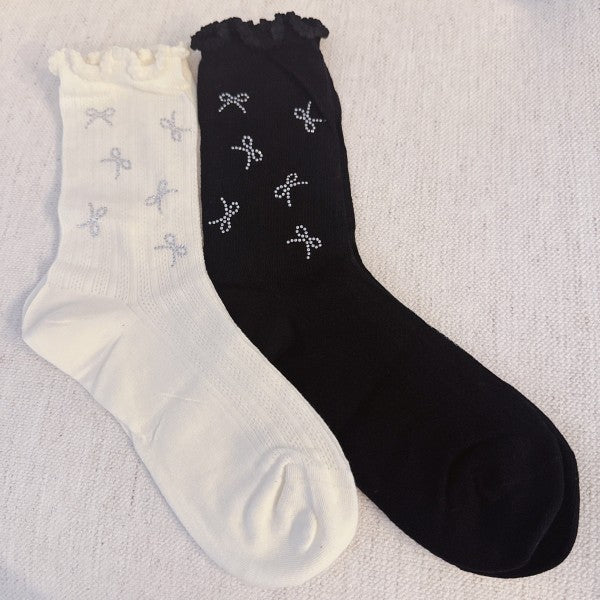 Indulge in luxury with our Scattered Bows Socks Set of 2. Made with a soft feel, these trendy socks are perfect for all seasons, adding a touch of elegance to any wardrobe. The scattered bow print adds a playful yet sophisticated touch, making them a must-have for any fashionista. Elevate your sock game with these exclusive pieces.