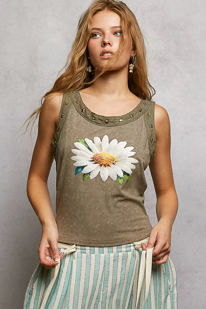 This slim fit sleeveless top is designed with a round neck and crafted from soft cotton jersey for a comfortable and flattering fit. The floral print, stud neck and arm hole point detailing add a touch of sophistication and style. The vintage washing technique gives it a unique and trendy, worn-in look. Available in a solid color, making it versatile and easy to pair with other items in your wardrobe. Elevate your casual outfit with this chic and stylish sleeveless top featuring intricate details and a vintage-inspired design.